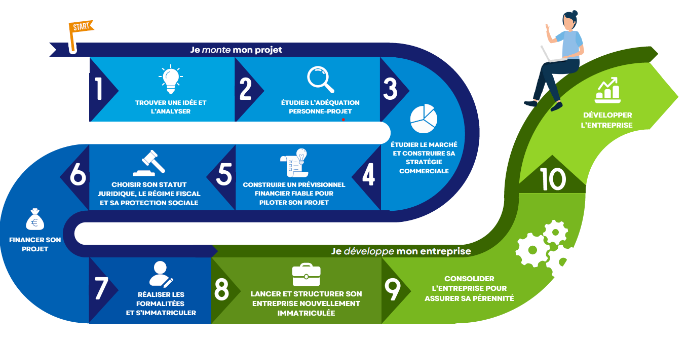 Nous pouvons vous accompagner dans toutes les étapes de l’étude de votre projet, les voici représentées sur ce « fil de la création d’entreprise » :